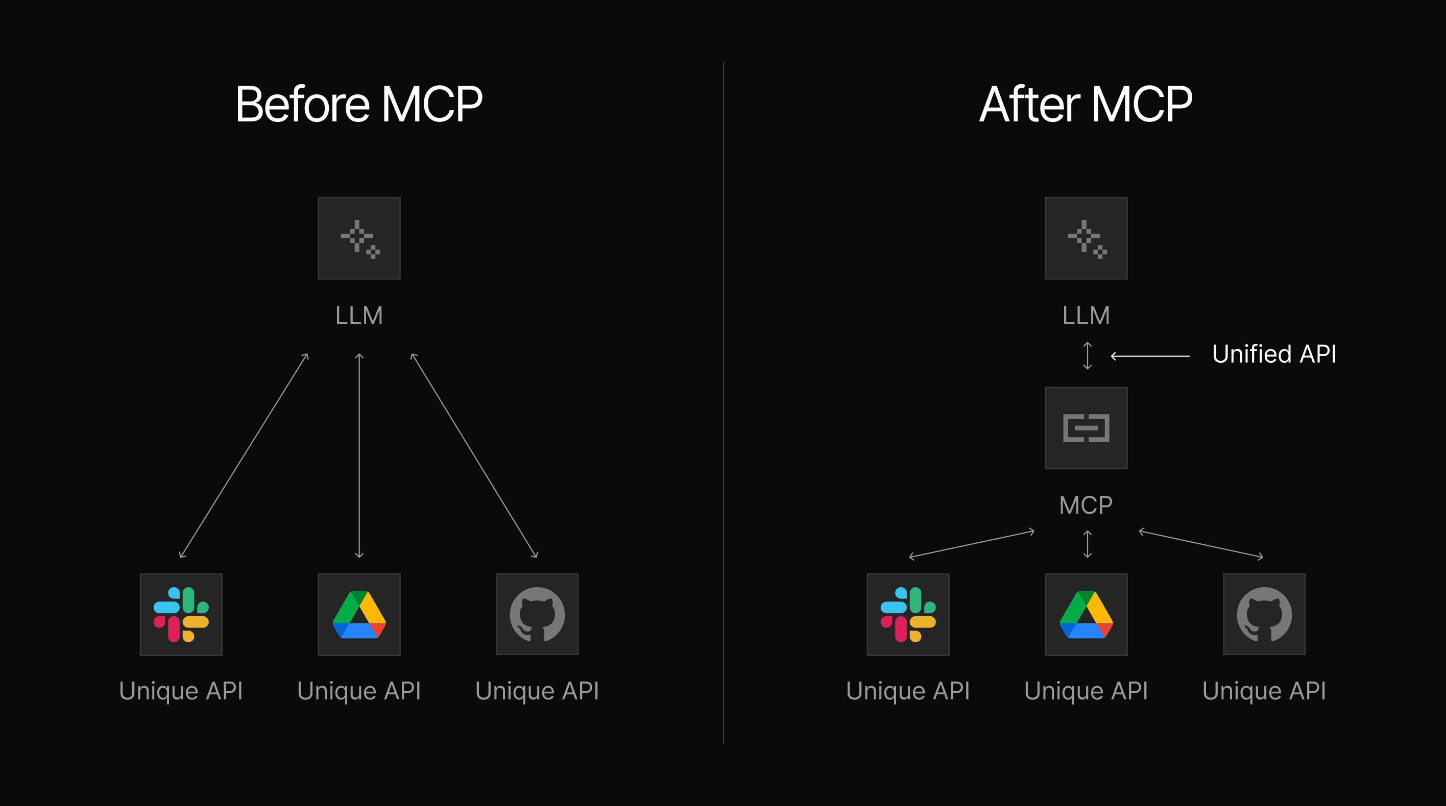 MCP fixes this with a single standardized connection layer. Consider the way USB standardized device connections. Before USB, every peripheral needed a specific port. After USB, any compliant device plugged into any compliant host. MCP does the same thing for AI agents and external tools: one protocol, infinite connections.