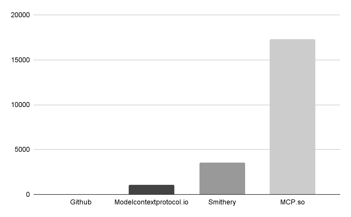 MCP.so has both the highest raw number of MCP projects that look like verified projects. The “Official MCP Registry” currently has the fewest, though that could increase if it gains the same kind of mass adoption as the registries launched before it.
