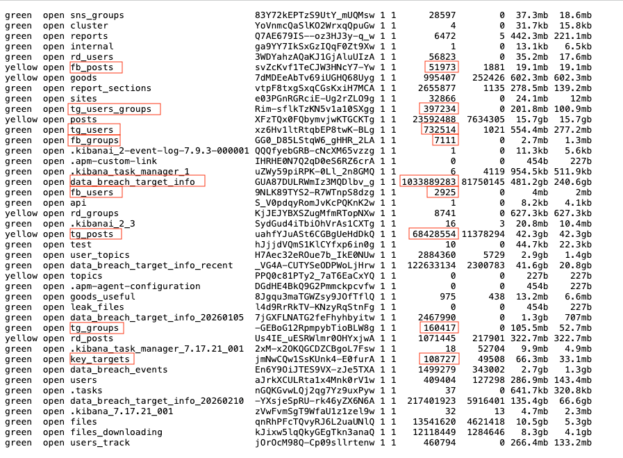 The exposed threat intel dataset corroborates this process. The index tg_groups has 160k entries for tracking Telegram groups, resulting in 732k objects in tg_users and 68MM in tg_posts.
