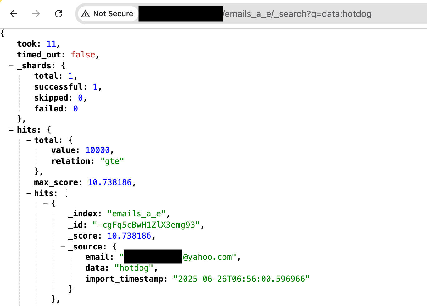 While most exposed databases require investigation to determine if they contain sensitive data, this one was obvious. The database had one index named “ssn” and another named “ssn2,” each containing millions of records with nine-digit numbers in a field labeled “ssn”. The database also had several indices that were collections of emails and associated passwords, sharded by first character of the email address.
