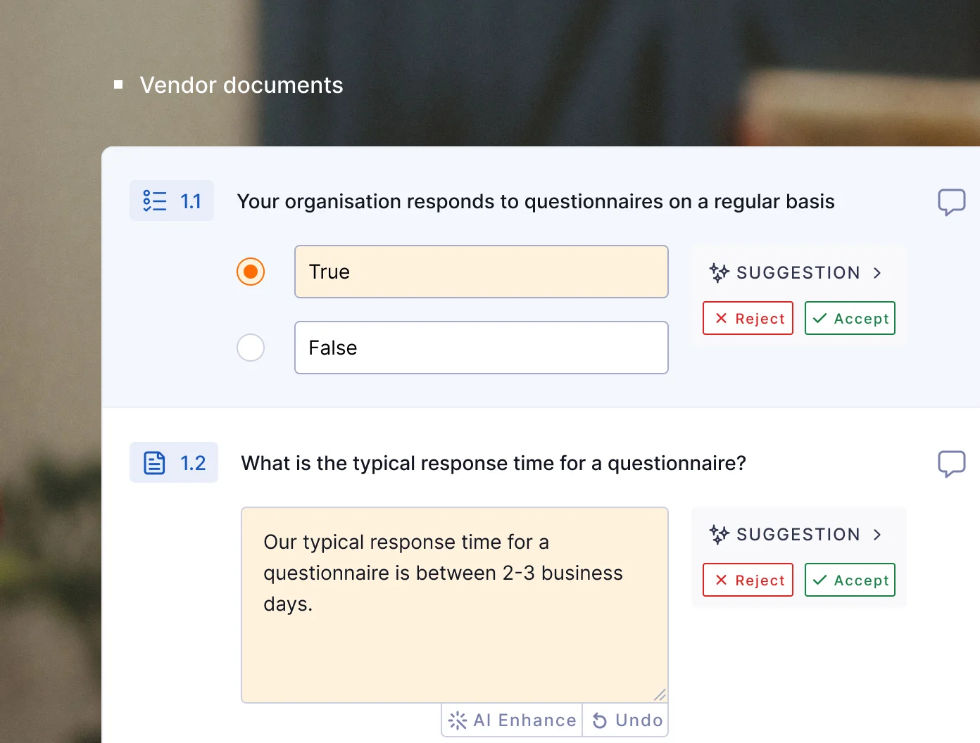 Get faster, cleaner responses with free AI assistance through UpGuard’s Trust Exchange — the secure platform vendors use to complete questionnaires. Your team receives what it needs sooner, without delays.