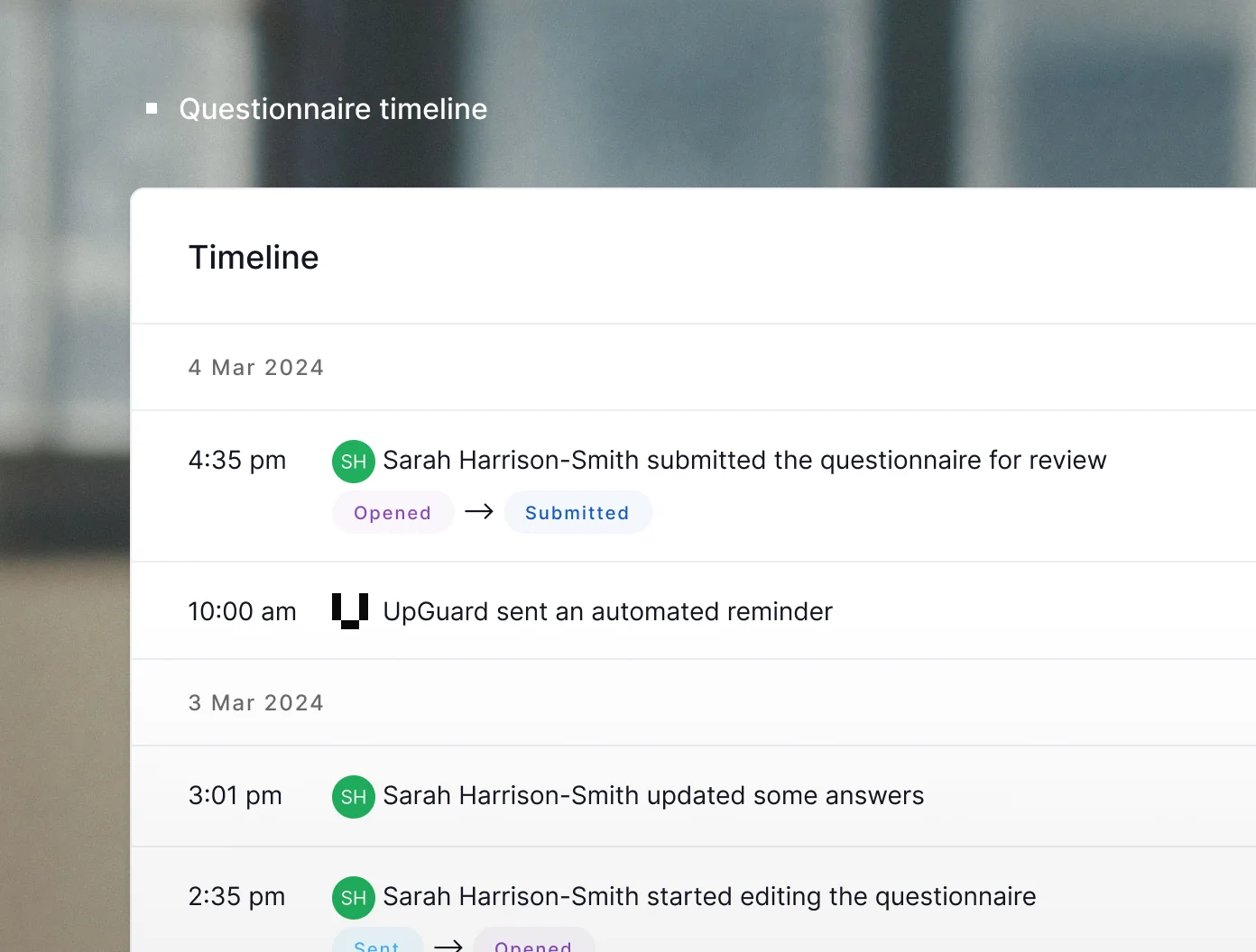 Manual questionnaires stall reviews and hide risk. With UpGuard, automation does the asking. Send questionnaires in seconds, see risk alongside answers, track every assessment, and keep reviews moving without the chase – all in a secure platform vendors trust.