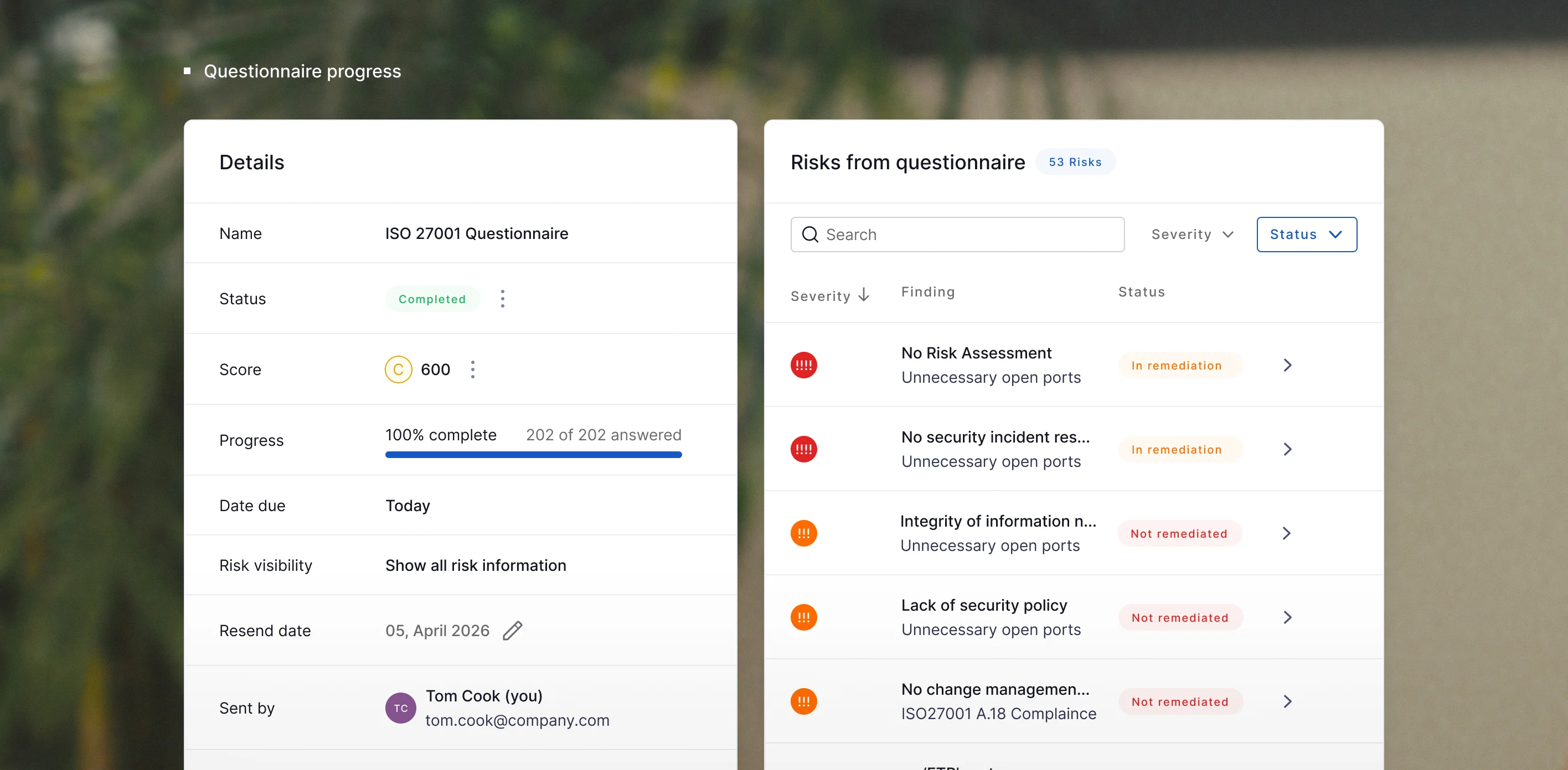 See every questionnaire’s status in one view. Drill down to real-time progress for each vendor, track completion as it happens, and keep reviews moving with automated reminders – with every answer and supporting document securely stored in one platform.