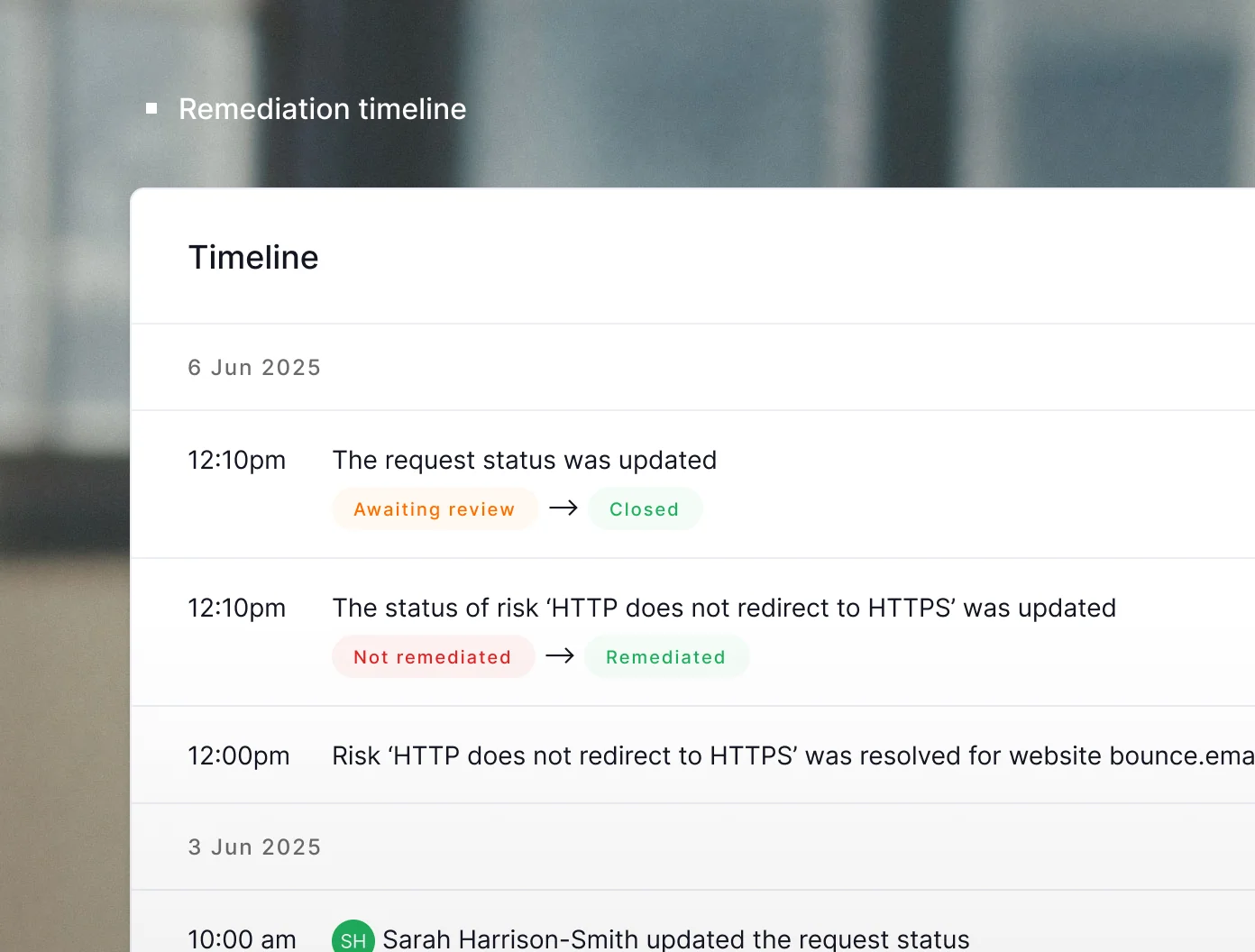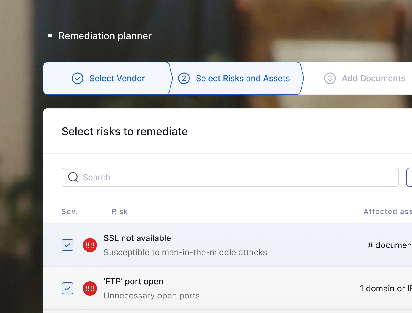 Identifying vendor risks is only half the job. Track fixes to completion, govern exceptions within your risk appetite, and keep a clean, auditable record of every decision. Fully native to your TPRM platform, uniting detection, remediation, and proof in one continuous flow.
