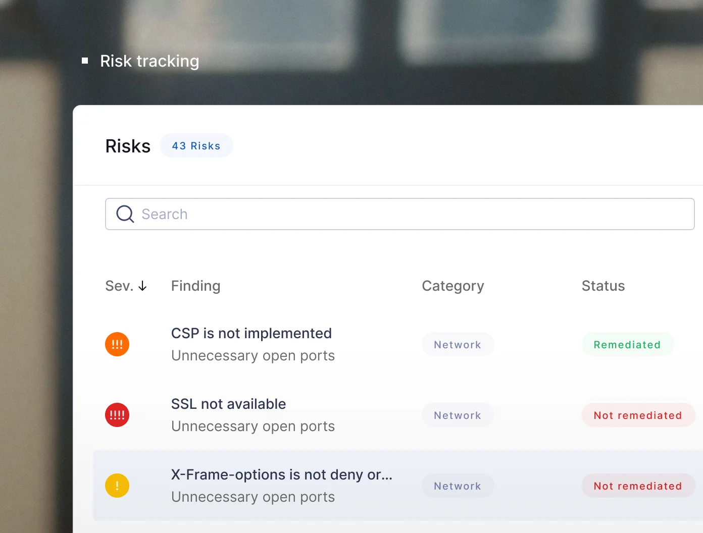Move faster from risk discovery to resolution. Get the context behind every risk, with detailed findings, suggested remediations, and severity indicators to help you prioritise, act, and move forward with confidence.